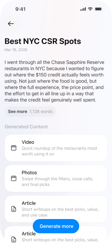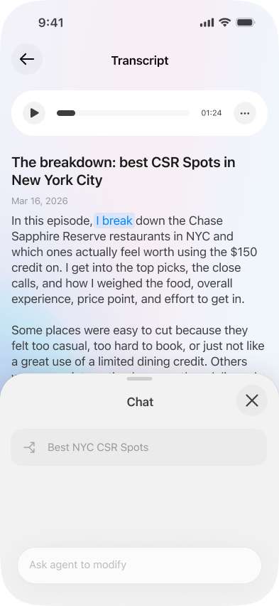 Each agent works on a different format simultaneously. Chat with any of them to refine the output until it's exactly right.
